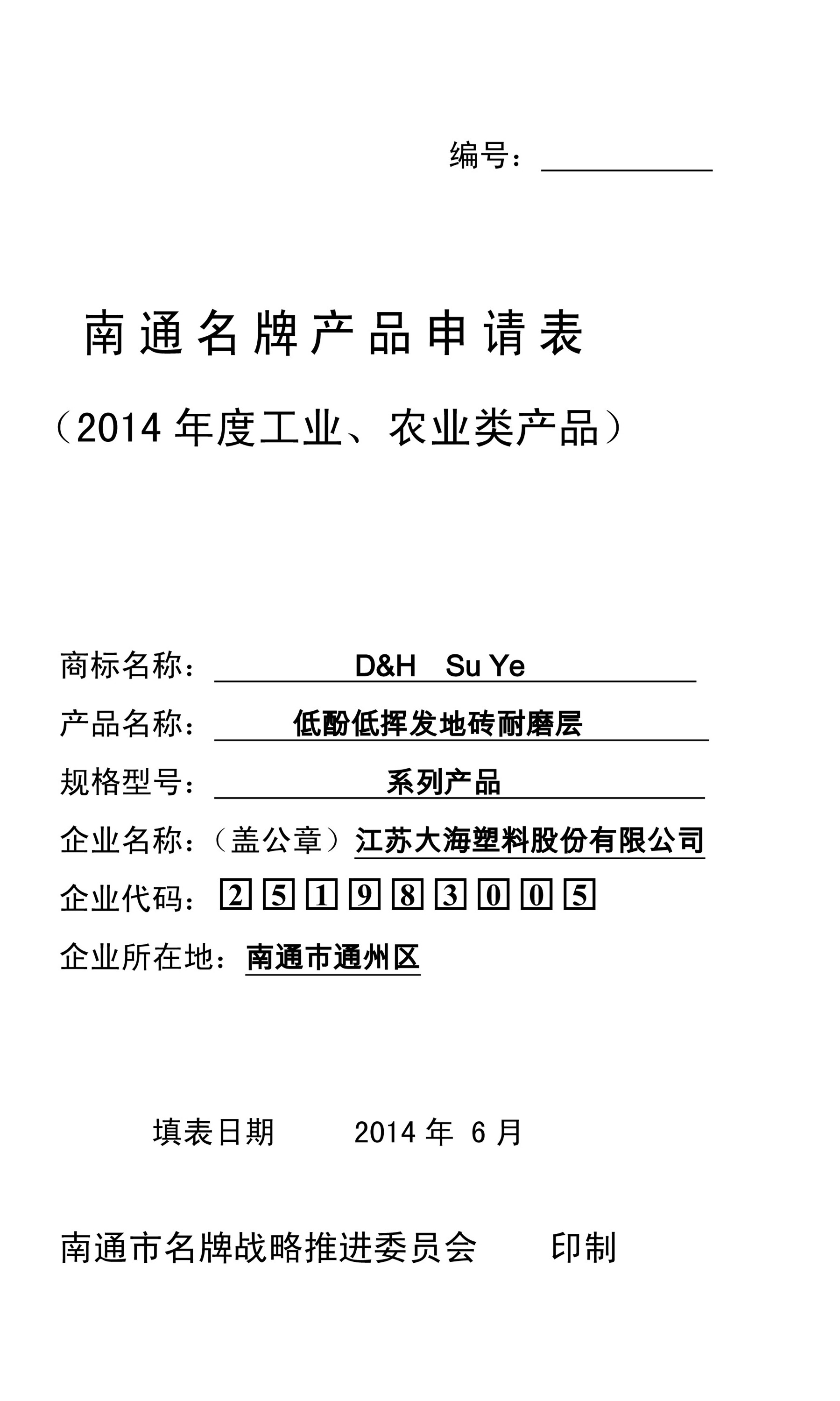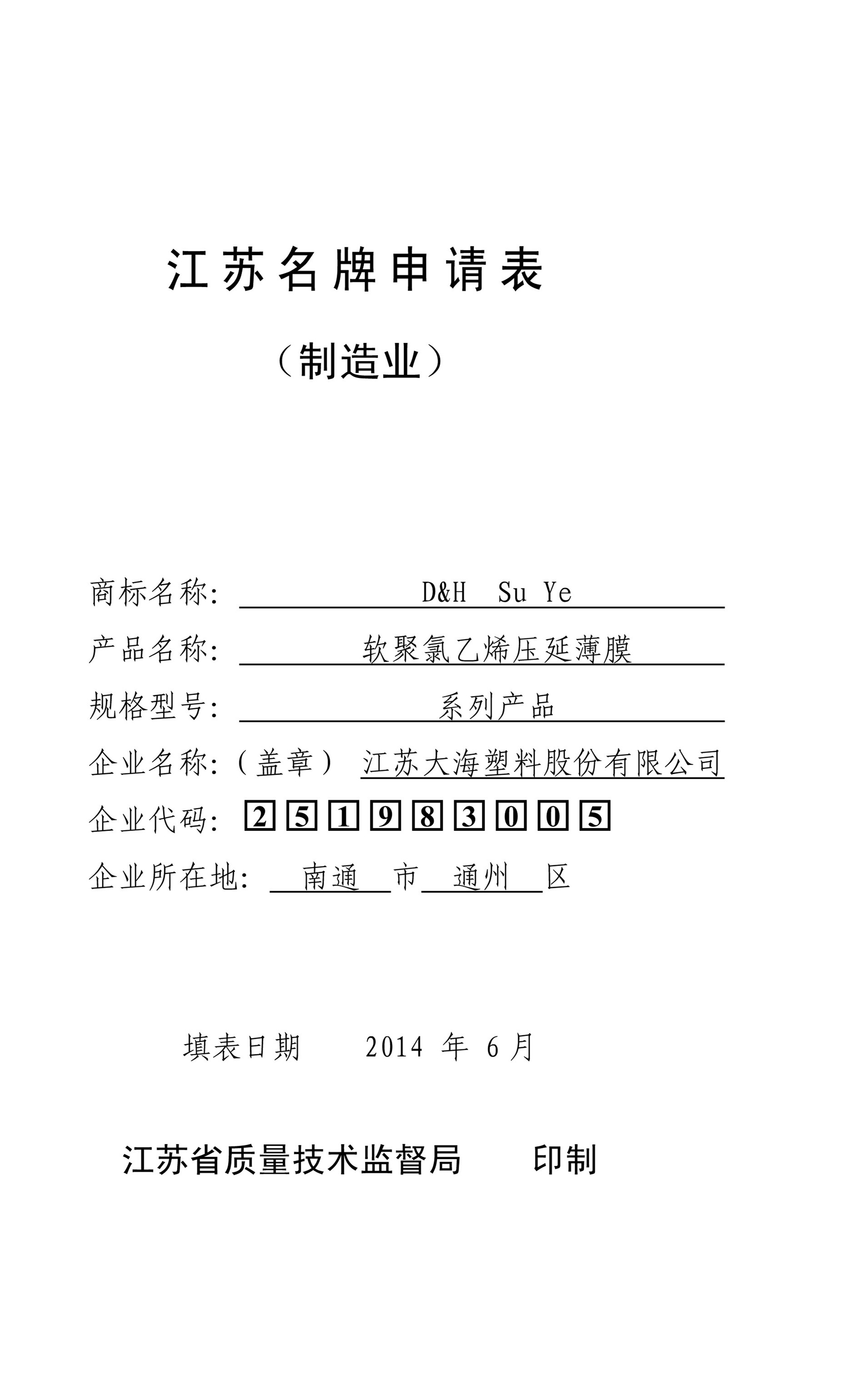 公司申報江蘇名牌、南通名牌各一個