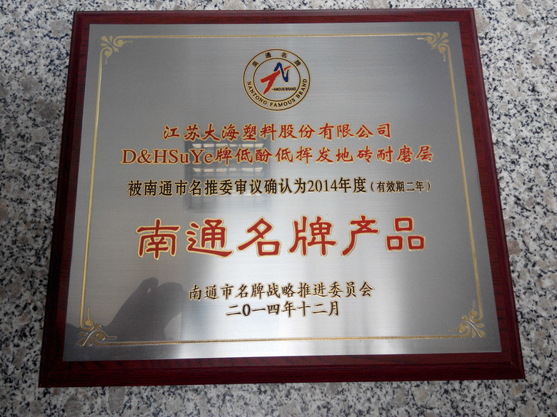 我公司獲得第二個(gè)南通名牌4月初,我公司去年申報(bào)的“D&H Su Ye牌低酚低揮發(fā)地磚耐磨層”獲評(píng)南通名牌(見下圖)。這是繼2013年“D&H Su Ye牌軟聚氯乙烯壓延薄膜”獲得南通名牌后,我公司得到的第二個(gè)南通名牌。 南通名牌正式命名后,在獲得區(qū)政府獎(jiǎng)勵(lì)的同時(shí),公司在推介和銷售該產(chǎn)品時(shí),可在產(chǎn)品標(biāo)簽上粘貼南通名牌標(biāo)識(shí)